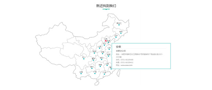 jQuery地图显示公司位置分布代码,一款适用于多地区分公司位置展示的网页特效,点击省份可查看该省份的所有分公司列表。