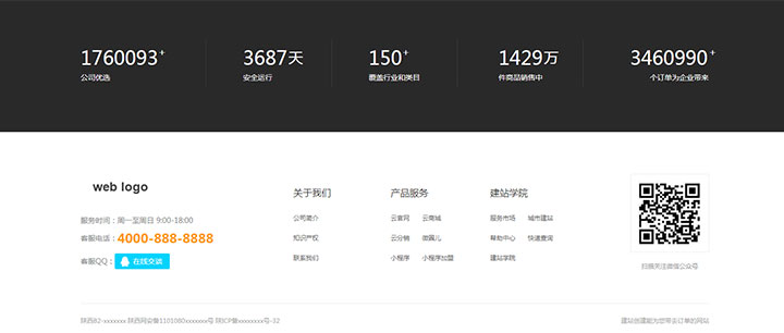 jQuery网站底部数字累加滚动动画效果,除了这个效果,还有底部导航栏、联系方式、二维码等布局样式。
