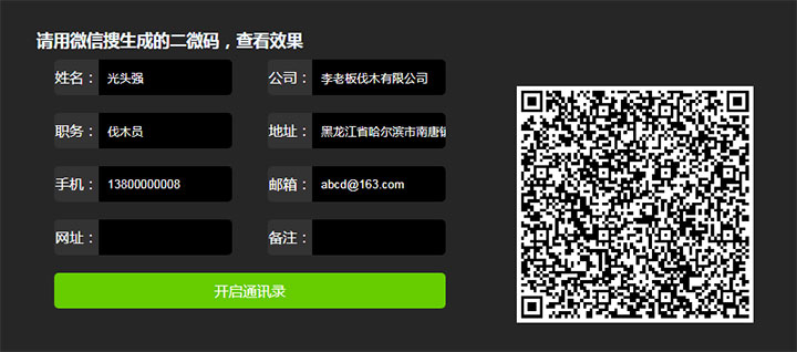 jQuery生成微信二维码名片扫码添加联系人代码,可以设置联系人姓名,公司,职务,地址,手机,邮箱,网址,备注信息生成二维码。