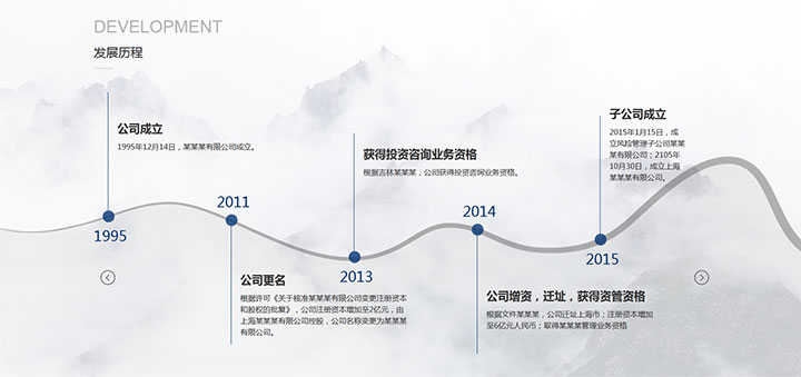一款jQuery基于swiper.js制作的公司发展历程水平时间轴特效,带波浪背景非常创意大气,鼠标拖动或左右箭头控制时间轴滚动。