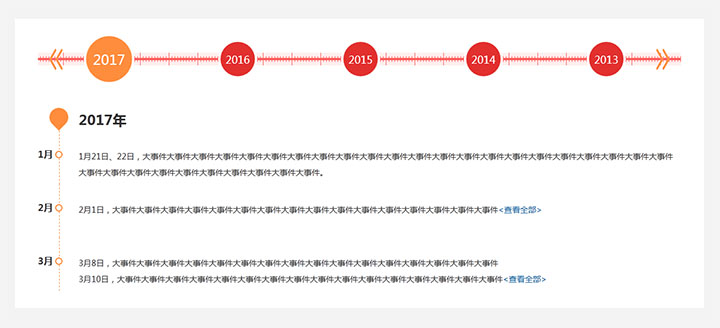 一款实用的jQuery水平滚动企业发展大事件时间轴代码,点击年份导航菜单或左右箭头按钮滚动切换到相应内容。