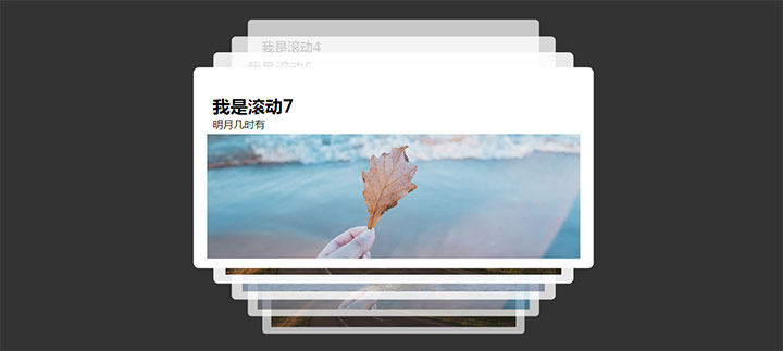 jQuery带标题图片层叠上下翻滚轮播切换特效,一款很有层次感的图文卡片叠加滚动切换效果,默认有主标题与副标题文字显示,你不需要的话可以去掉。
