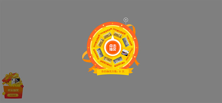 一款界面设计得非常好看的jQuery点击遮罩弹出幸运大转盘抽奖代码,点击左下角悬浮抽奖广告图片弹出转盘抽奖,抽奖完成后再弹出抽奖结果并领取奖品窗口。
