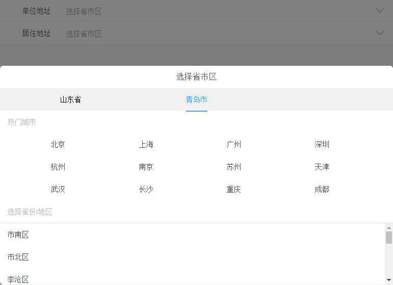 jQuery手机移动端省市区城市三级联动选择代码,点击遮罩弹出选择省市区,支持设置默认热门城市地区,同一页面可多次使用。