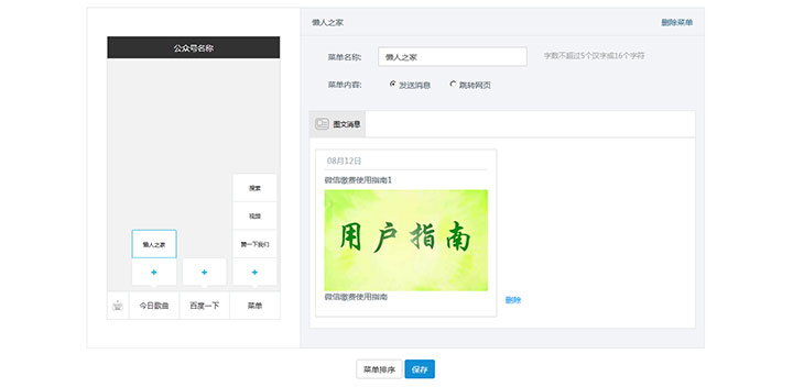 功能强大的jQuery仿微信公众号自定义菜单界面操作代码,微信公众号后台管理界面菜单编辑效果,还可以删除菜单、菜单排序等操作。