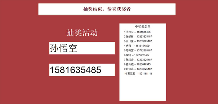 这是一款很简单的jQuery倒计时自动随机抽奖代码,倒计时结束后自动抽取中奖者的姓名和手机号码。js注释非常详细,新手也能用。