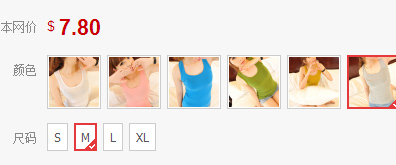 适合各种购物类网站特效,可供在“颜色”和“尺码”之间来回切换,同时价格也会不断的切换。如果设计购物类网站的童鞋们遇到问题,可以拿来试试啦