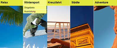 又一款不同风格的手风琴效果,顶部为菜单导航,支持二级下拉样式。当鼠标悬停在顶部导航时,底部对应的图片向左右两侧展开,其他图片则收缩隐藏