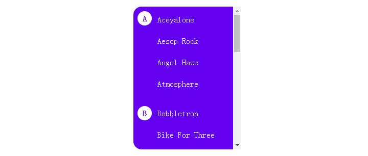 基于js+css3实现的一款简单的侧边栏滚动显示首字母索引特效。