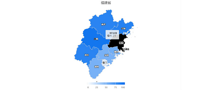 这是一款基于html5 svg制作的福建省热力地图代码,各个区域的地图颜色根据数据的大小由深到浅色显示。