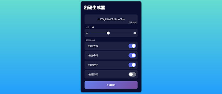 js+css3制作的一款随机密码生成器代码,界面UI非常棒的,支持自定义大小写,数字,符号,字符长度等。