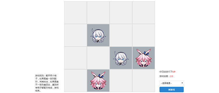 一款原生js开发的记忆翻牌匹配小游戏代码,有多种难度模式可以选择。游戏规则:翻开两个格子,如果图案一致则配对,将其挑出,如果图案不一致则盖回去,直到所有格子都配对完成,游戏结束。