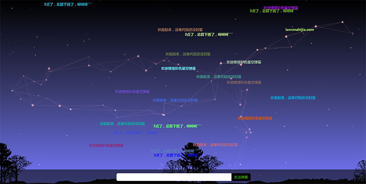 js全屏酷炫星空背景发送弹幕文字特效,彩色文字弹幕循环滚动动画特效,以前发布过一个类似的特效,但是效果没这么多和酷炫。
