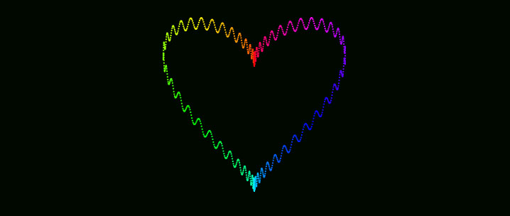html5 canvas绘制的彩虹心形变形动画特效,十分好看的一款彩色粒子线条变换爱心图形动画效果。