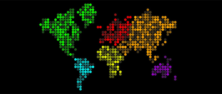 css3绘制一款很有创意的彩色点像素世界地图特效,有心的朋友可以学习此法绘制出其它图形动画效果。