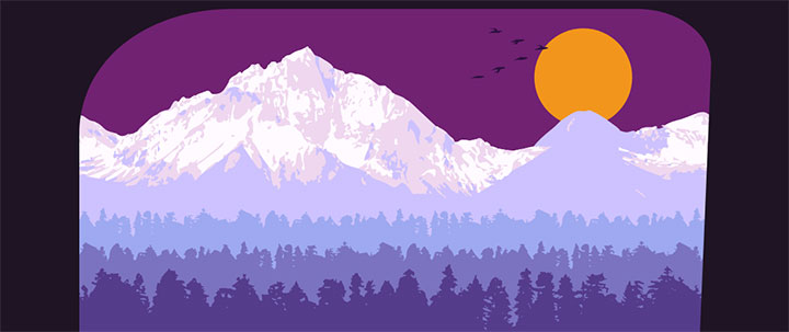 HTML5 SVG基于TweenMax绘制的雪山树林日落动画场景特效,感觉就像坐在车里看着车窗外的风景。