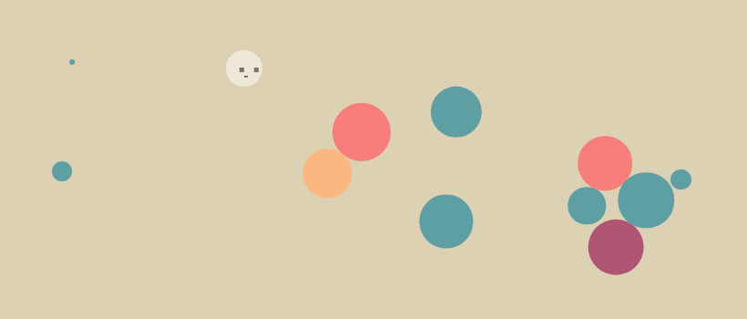 一款基于HTML5+jQuery绘制的圆球碰撞动画特效,白色圆球跟随鼠标移动,其它圆球一直追着白色圆球跑,鼠标可控制白色圆球与其它圆球相互撞击或者闪躲。