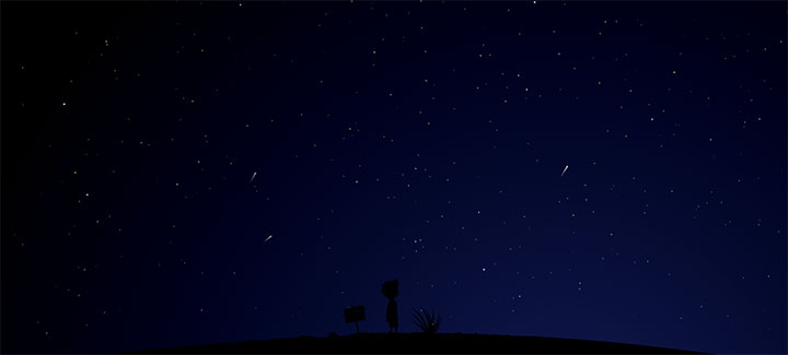 html5 canvas画布基于svg绘制的人物在山坡上看着夜空中星星流星动画场景特效。