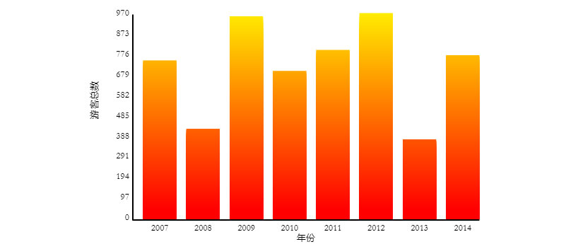 一款简单的HTML5 Canvas每年游客人数统计柱状图表代码,渐变样式柱状柱形图代码。