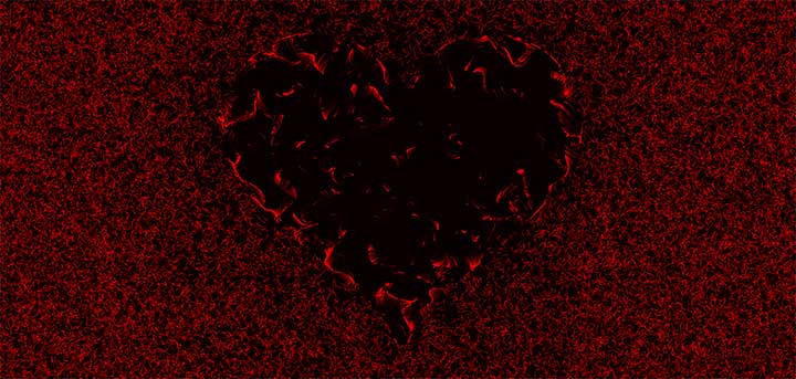 HTML5 Canvas绘制的粒子流动爱心形状动画特效,红色粒子组成爱心动画效果。