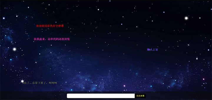js全屏星空背景发送文字弹幕动画特效,动画效果基于animation.css动画库,弹幕文字颜色随机显示。