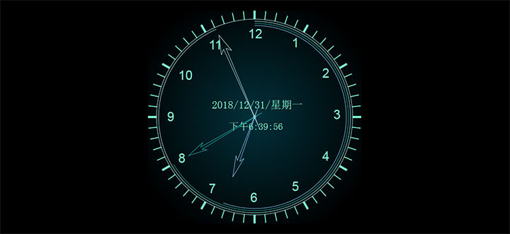 html5 canvas创意个性圆形时钟代码,获取本地时间显示,同时还在时钟中间显示年月日星期和数字时间。