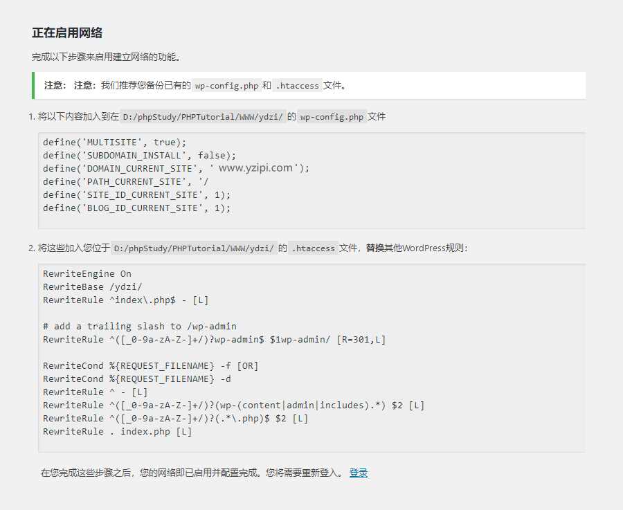 有些同学,完成配置后,打不开子站的仪表盘和网站,这伪静态出问题。上面第二步 ,后台贴出 .htaccess