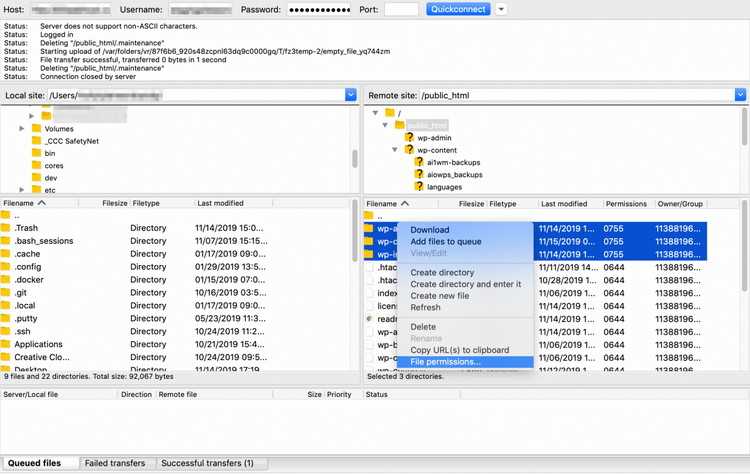 整理权限的最佳方法是使用FTP。连接到服务器后,选择wp-admin、wp-includes和wp-content。右键单击它们,然后选择“文件权限”: