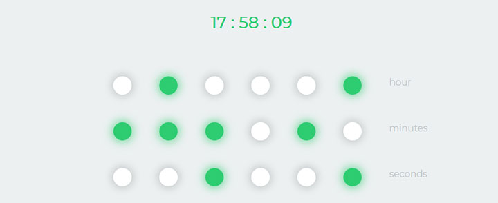一款很烧脑的jQuery二进制数字时钟代码,时分秒都是用二进制来表示,绿色表示该位值是1,灰色则表示0。其实实现原理也是很简单,无非是将时钟的时分秒分别实时转换成二进制,然后随着本地时间的更新而实时刷新。一般人看不懂吧?
