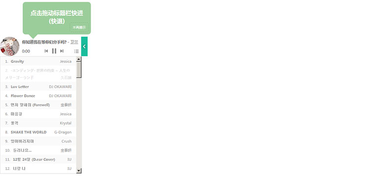 QPlayer左下角悬浮多功能mp3音乐播放器插件是一款基于jQuery+HTML5制作的网站在线音乐播放器代码,支持多首歌单列表,带歌名、图片、拖动进度、上一首、下一首切换等功能。