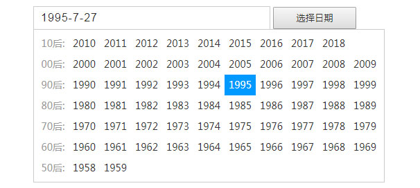 这是一款非常人性化的jQuery交互式日期选择代码,点击先弹出年份选择,选择后再弹出月份跟日子,可用于出生日期选择插件。 调用方法: el:DOM元素 (必填参数) start:开始年份 (可不填参数) end:结束年份 (可不填参数) 注意事项: 1、由于列表是降序,输出,start为最大年份,end为最小年份; 2、start 和 end 都必须为数值型(必须同时传入); 3、若未传start 和 end 在未传时,最大年份为当前年份,最小年份为当前年份的60年前(如:2017-60)。