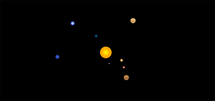 HTML5行星围绕太阳轨迹运动场景动画特效,虽然比较简单,但也有九大行星围绕太阳运动的意境存在。