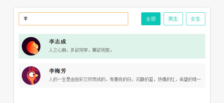 一款界面设计的十分漂亮的js+ajax关键词搜索条件筛选内容列表代码,通过ajax获取内容数据,输入关键词搜索查找相关内容,还有全部、男生、女生分类选择。