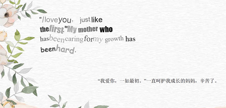这是一款很温馨的CSS3母亲节感恩节寄语文字动画特效,也可以运用于其他场景,首先要选一张氛围合适的背景图,再配上文字就可以了。