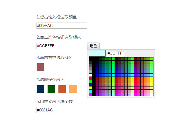 jQuery点击文本框网页颜色拾色器代码是一款鼠标点击显示颜色选取器代码特效,本代码可选择拾取多个颜色。