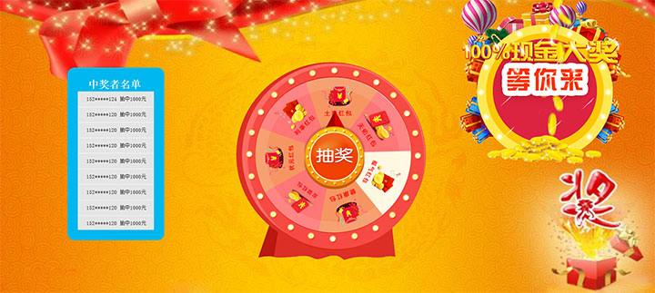 这是一款带左侧中奖名单滚动显示的jQuery滚动大转盘抽奖代码,点击圆形抽奖按钮开始抽奖,抽奖结束弹出中奖提示!