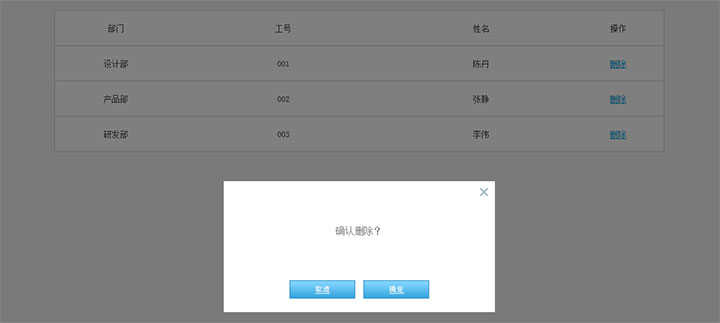 jQuery点击弹出确认删除对话框代码是一款鼠标点击删除弹出对话框让用户确认是否删除行数据代码。