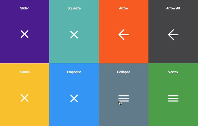 本素材里面包含18种不同的汉堡图标变形动画效果,分别是汉堡图标与前进后退关闭图标之间的动画切换,你可以通过Sass文件来自定义你自己的汉堡包图标变形动画、颜色、大小之类。