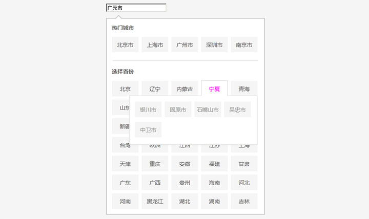 一款简洁实用的jQuery下拉框城市选择插件,简单的jQuery城市选择代码,字段值可以自定义,可以添加选择城市后的回调事件。