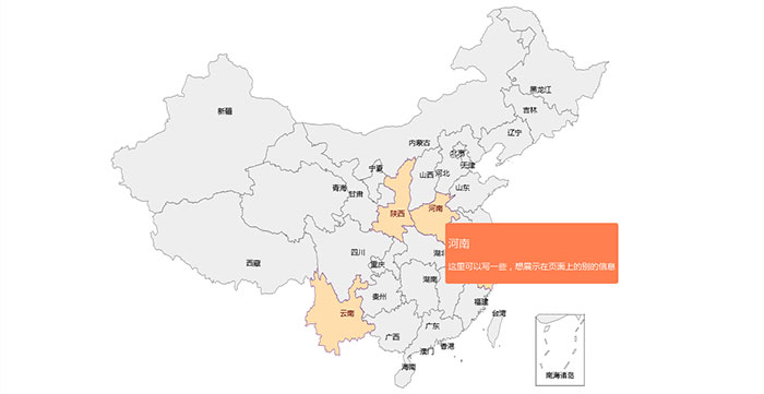 一款实用的echarts基于html5 canvas中国地图省市地区介绍代码,鼠标悬浮地图省份区域时,悬浮提示方式显示自定义该区域文字内容介绍效果。