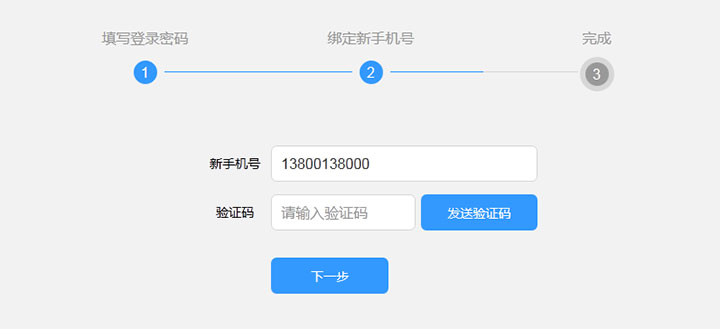 这是一款非常实用的js修改绑定手机号码流程步骤表单代码,分步骤修改设置用户新手机号码。