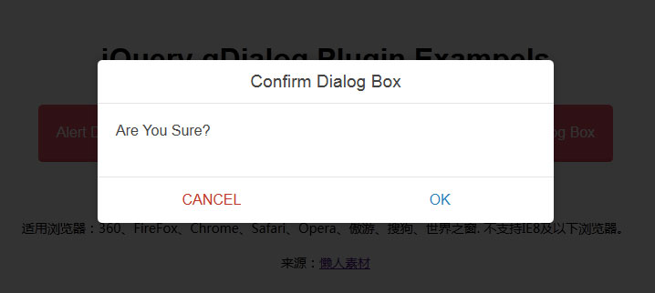 gDialog是一款扁平样式风格带有动画弹出效果的jQuery对话框插件,jQuery对话框代码,适用于移动端,并平滑兼容IE浏览器,配合animate.css能实现许多炫酷的效果。