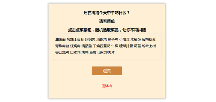 一款十分简单的原生js实现的随机点菜代码,点击点菜按钮随机点取上面菜单的菜品,可根据需求改成自己需要功能,比如说随机点名。