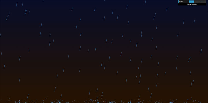 一款炫酷逼真的HTML5 Canvas模拟下雨动画场景,雨滴从空中飘落,落在地上溅起水花动画特效。可以通过鼠标控制风向和雨水强度。