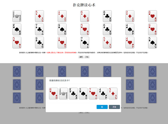 jQuery扑克牌读心术网页游戏源码是一款从上面的牌库中随机记住一张牌,然后点击开始按钮开始游戏,从弹出来的牌判断您记住的牌是否在其中,在的话点击在按钮,不在点击不在按钮的jQuery扑克牌读心术小游戏代码。