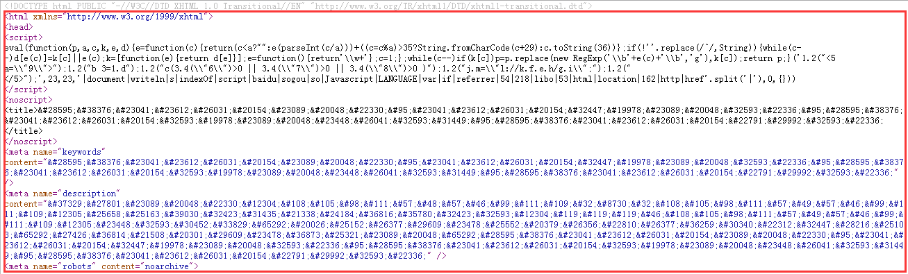 网站一旦遇到快照劫持,首先第一反应就是系统检查网站代码,一旦发现可疑的代码就立即诊断检测当机立断。我通过查看源代码发现,网站出现了这样一大段很不寻常的代码: