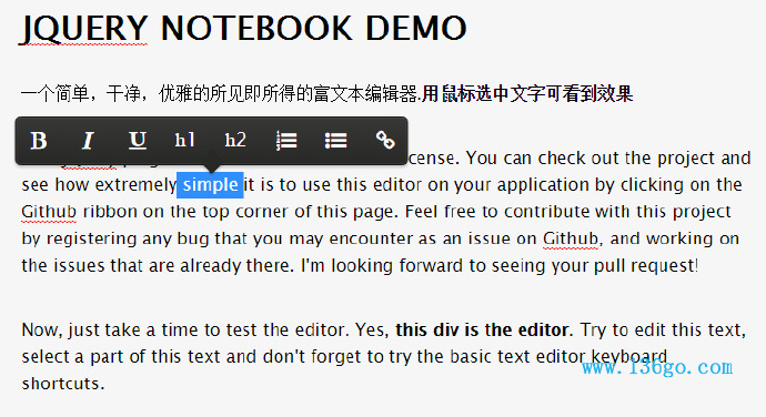 一个简单,干净,优雅的所见即所得的富文本编辑器.用鼠标选中文字可看到效果。
