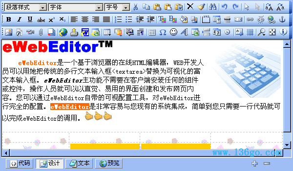 eWebEditor是一个基于浏览器的在线HTML编辑器,WEB开发人员可以用她把传统的多行文本输入框textarea替换为可视化的富文本输入框。 eWebEditor主功能不需要在客户端安装任何的组件或控件,操作人员就可以以直觉、易用的界面创建和发布网页内容。 您可以通过eWebEditor自带的可视配置工具,对eWebEditor进行完全的配置。 eWebEditor是非常容易与您现有的系统集成,简单到您只需要一行代码就可以完成eWebEditor的调用。 您可以把eWebEditor应用于各种基于网页的应用系统中,如内容管理系统、邮件系统、论坛系统、新闻发布系统,等与内容发布相关的所有应用系统。