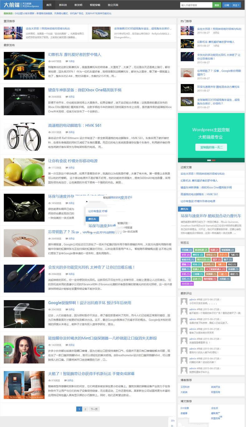 大前端D8 主题是一款非常牛逼的WordPress博客主题,响应式,功能齐全,支持手机,电脑,平板,非常适合做博客站,主题内置了7个小工具,多种侧栏组合和6+独立页面:投稿、标签、存档、读者墙、友链、案例展示.等等等更多功能,下面看看这次