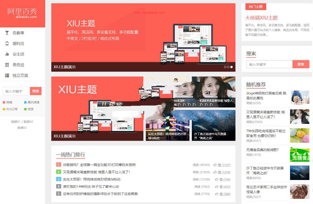 XIU主题是一款WordPress主题,支持百度熊掌号,适用于图片展示、多元化图片新闻展示、个人博客、资源分享站,扁平化设计、简洁风、全面SEO优化、多重列表展示方式 ,响应式布局支持电脑、平板和手机的完美展示。